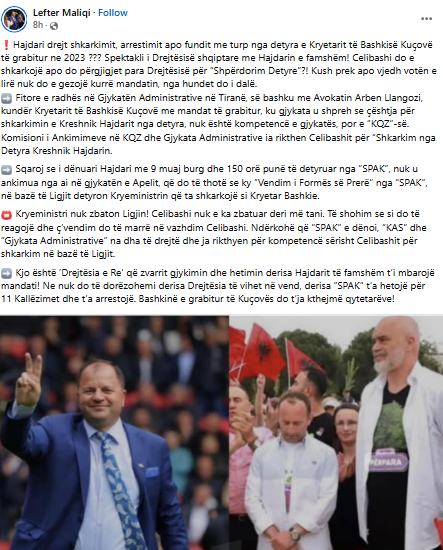 Maliqi shkruan më tej se ka korrur “fitoren e radhës në Gjykatën Administrative në Tiranë, së bashku me Avokatin Arben Llangozi, kundër Kryetarit të Bashkisë Kuçovë me mandat të grabitur, ku gjykata u shpreh se çështja për shkarkimin e Kreshnik Hajdarit nga detyra, nuk është kompetencë e gjykatës, por e “KQZ”-së. Komisioni i Ankimimeve në KQZ dhe Gjykata Administrative ia rikthen Celibashit për “Shkarkim nga Detyra Kreshnik Hajdarin.