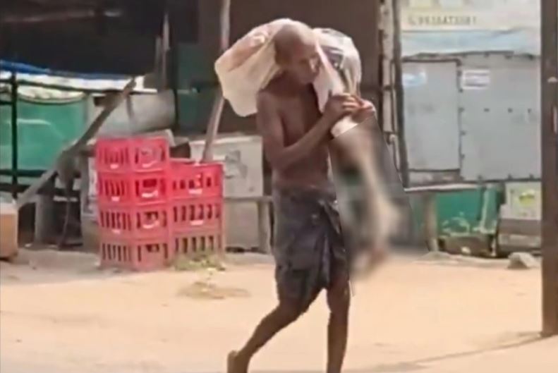 Pamjet e transmetuara nga kanalet televizive indiane e tregojnë atë duke mbajtur në shpatull atë që duket të jetë një kufomë, pjesërisht të mbështjellë me një qese plastike.