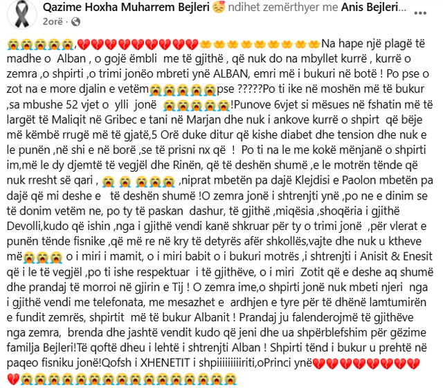 Nëna e tij, Qazime Bejleri, përmes një postimi në llogarinë e saj në rrejtin social “Facebook” ka bërë një dedikim shumë prekës për të birin e ndjerë, zemërthyer ajo shkruan: “Na hape një plagë të madhe o Alban , o gojë ëmbli me të gjithë , që nuk do na mbyllet kurrë , kurrë o zemra ,o shpirti ,o trimi jonë o mbreti ynë ALBAN, emri më i bukuri në botë ! Po pse o zot na e more djalin e vetëm”.