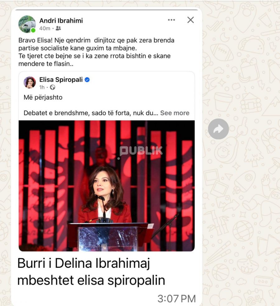 Andri Ibrahimi, ish-bashkëshorti i ministres Delina Ibrahimaj, ka shprehur hapur mbështetjen e tij për qëndrimin e mbajtur nga Elisa Spiropali, duke e cilësuar atë si një zë të rrallë kritik brenda partisë.