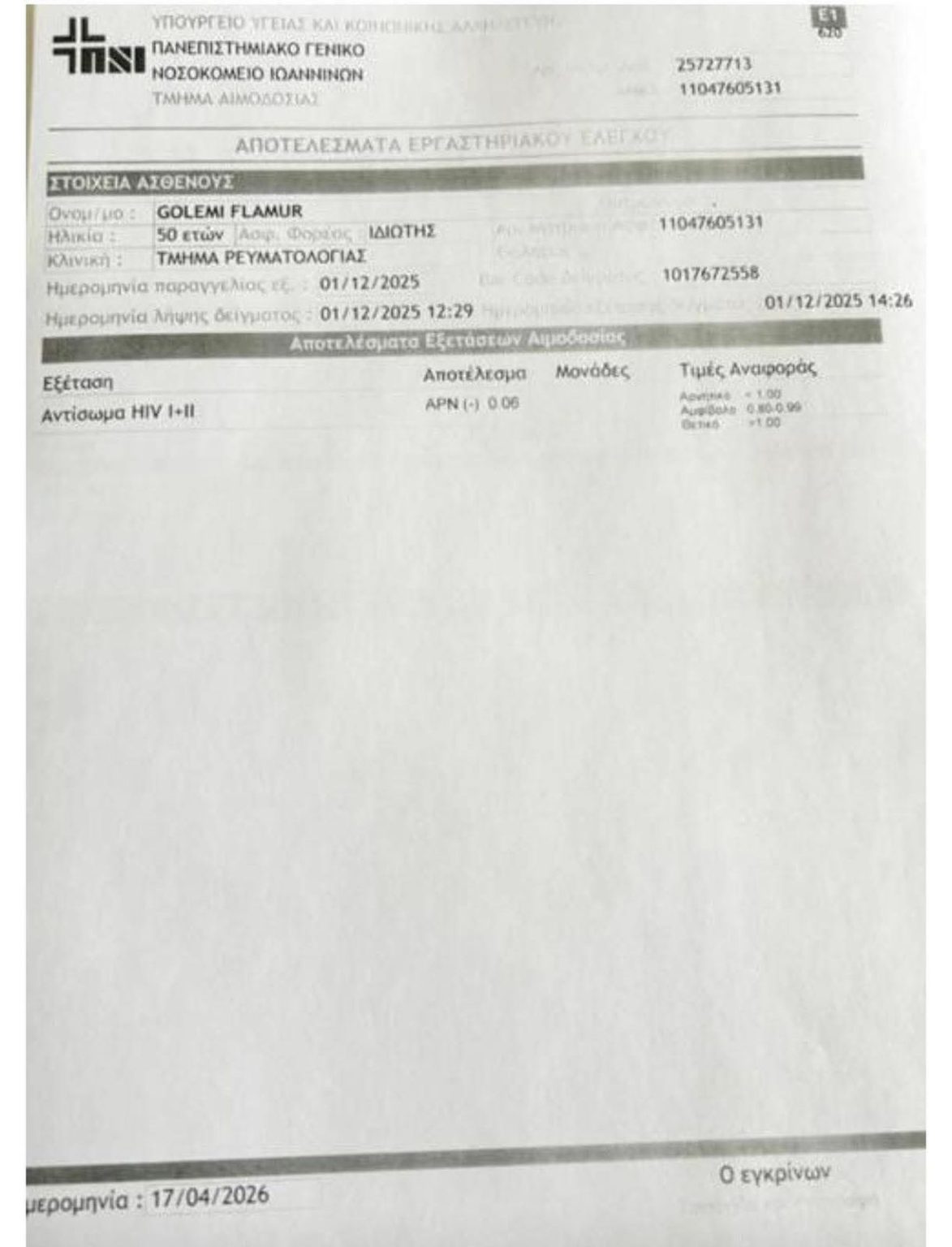 Kjo është përgjigja zyrtare e analizave të kryera nga kryebashkiaku gjirokastrit Flamur Golemi në Spitalin e Janinës. Siç e konfirmon përgjigja, ngarkesa virale është e ulët dhe Golemi rezulton negativ.