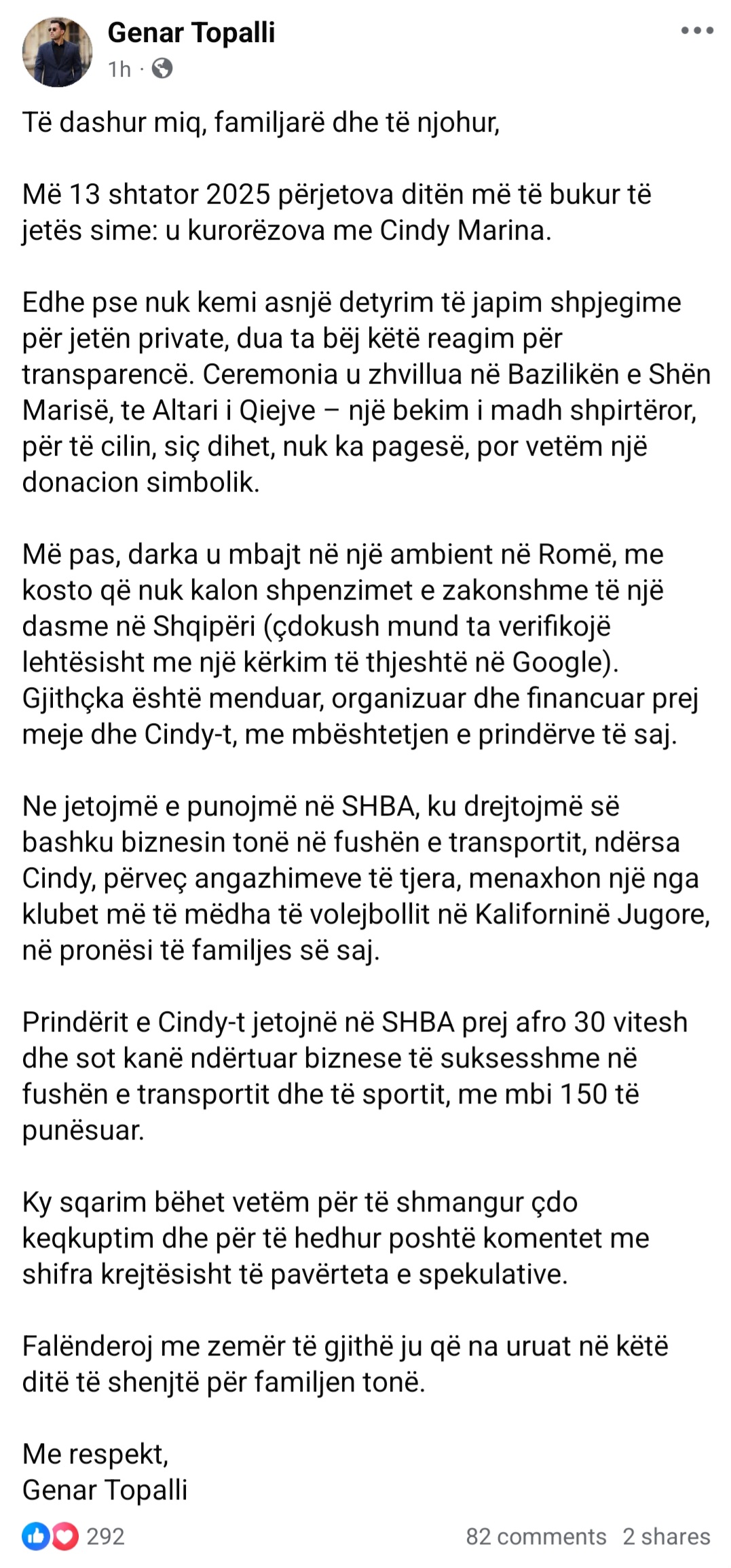 “Ky sqarim bëhet vetëm për të shmangur çdo shifër krejtësisht të pavërtetë e spekulative,” shkruan Topalli, duke falënderuar të gjithë për urimet e marra në këtë ditë të shenjtë për familjen e tij.