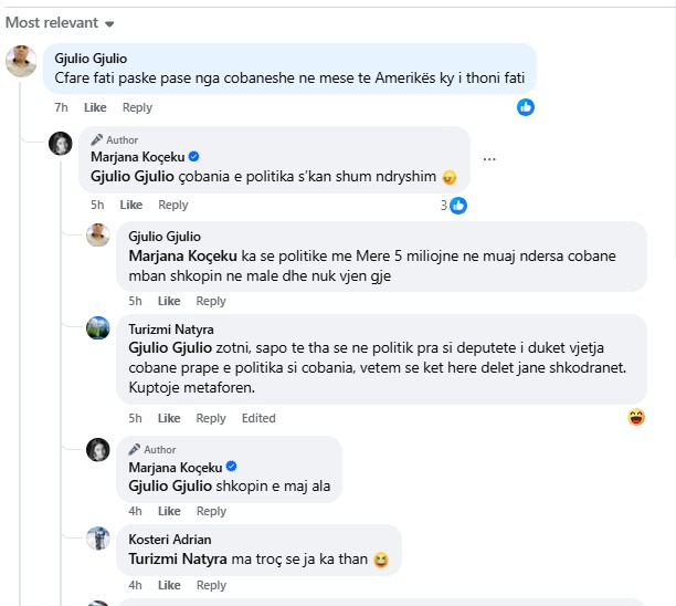 Përgjigja e deputetës është e habitshme. “Çobania e politika s’kan shum ndryshim”, shprehet “neomalësorja”. Duket sikur i flet nënndërgjegja. Mbase llogaritë në Facebook të deputetëve i ka zyra e Kryeministri Rama dhe shkruan në emër të tyre!!!
