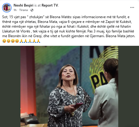 Sot, 15 vjet pas ” zhdukjes” së Bleona Matës: sipas informacioneve më të fundit, e thënë nga një shtetas, Bleona Mata, vajza 6 vjeçare e rrëmbyer në Zapot të Kukësit, është rrëmbyer nga një fshatar po nga ai fshat i Kukësit, dhe është sjellë në fshatin Llakatun të Vlorës , tek vajza e tij që nuk kishte fëmijë. Pas 3 muaj, kjo familje bashkë me Bleonën ikin në Greqi, dhe vitet e fundit gjenden në Gjermani. Bleona Mata jeton.🥲🥲🥲🥲🙏🙏🙏🙏🙏