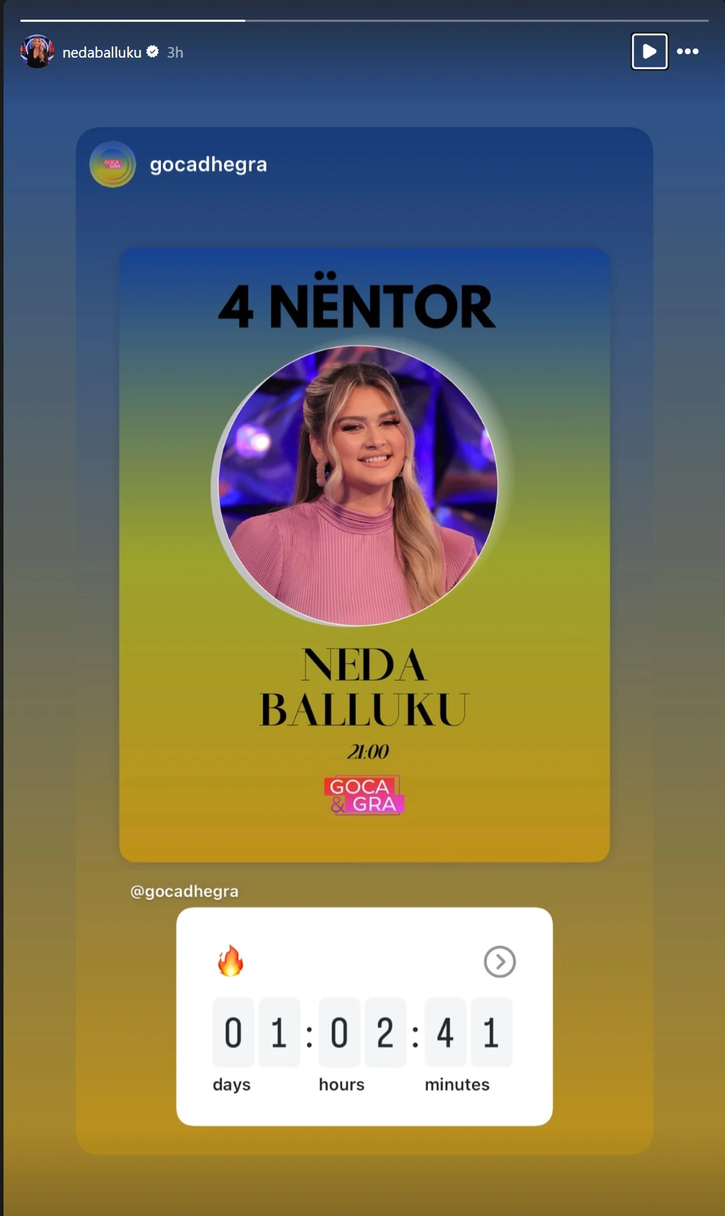 Nje postim ne instagramin e saj, Neda ka njoftuar se diten e neserme nga ora 21:00 do te jete e ftuar ne Goca Dhe Gra Ndoshta ne kete interviste neda do te jape detaje per divorcin e saje pas marteses 10 vjecare, na mbetet te presim.