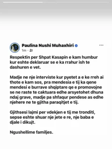 Gazetarja dhe panelistja e emisionit “Zanat”, Paulina Nushi, ka reaguar dje pas lajmit të ndarjes nga jeta të këngëtarit Shpat Kasapi.