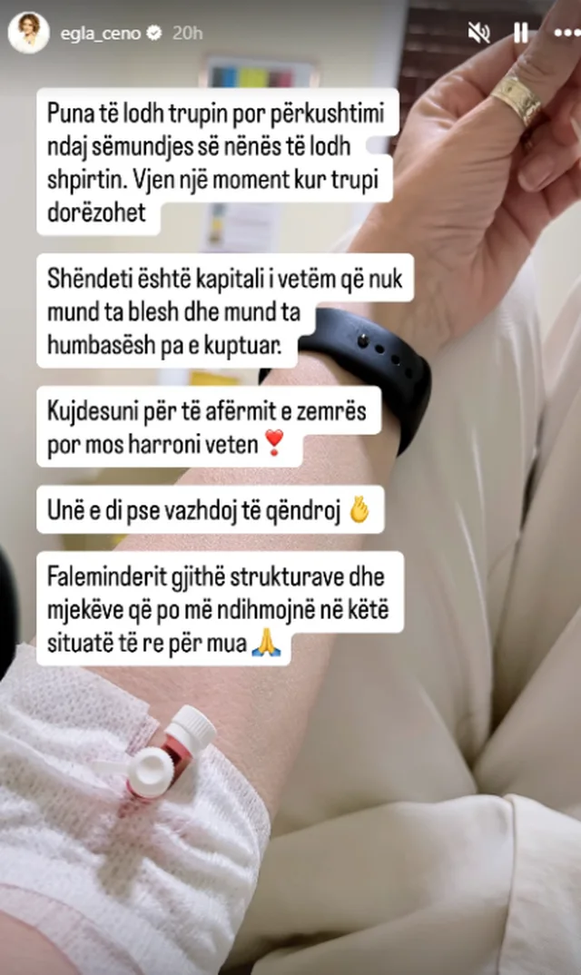 Në foton e publikuar, Egla shfaqet në një ambient spitalor, me serum në krah, një detaj që tregon situatën delikate që po përjeton. Përmes disa rreshtave të sinqertë, aktorja rrëfen lodhjen jo vetëm fizike, por edhe emocionale që vjen nga përkushtimi ndaj një personi të dashur që po përballet me sëmundjen.