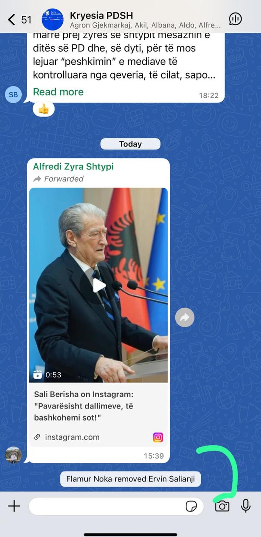 Sekretari i Përgjithshëm i Partisë Demokratike Flamur Noka ka hequr nga grupi i Kryesisë në Whatsapp Ervin Salianjin. Do të ketë qenë deklarata e këtij të fundit e bërë në protestën e mbrëmjes së sotme teksa iu përgjigj Nokës dhe Berishës duke thënë “Nuk më përjashton dot askush nga partia”.