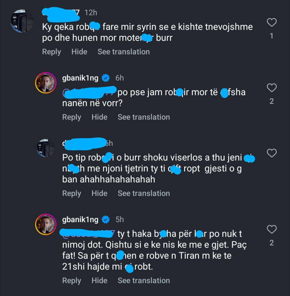 Gjithçka eskaloi kur në një nga postimet e medias tonë, një komentues përdori fjalor banal dhe fyes ndaj pamjes së G-Banit, duke e vënë në shënjestër për operacionin. Komenti u kap nga vetë artisti, i cili reagoi menjëherë dhe ashpër, duke e kthyer debatit një gjuhë po aq të rëndë.