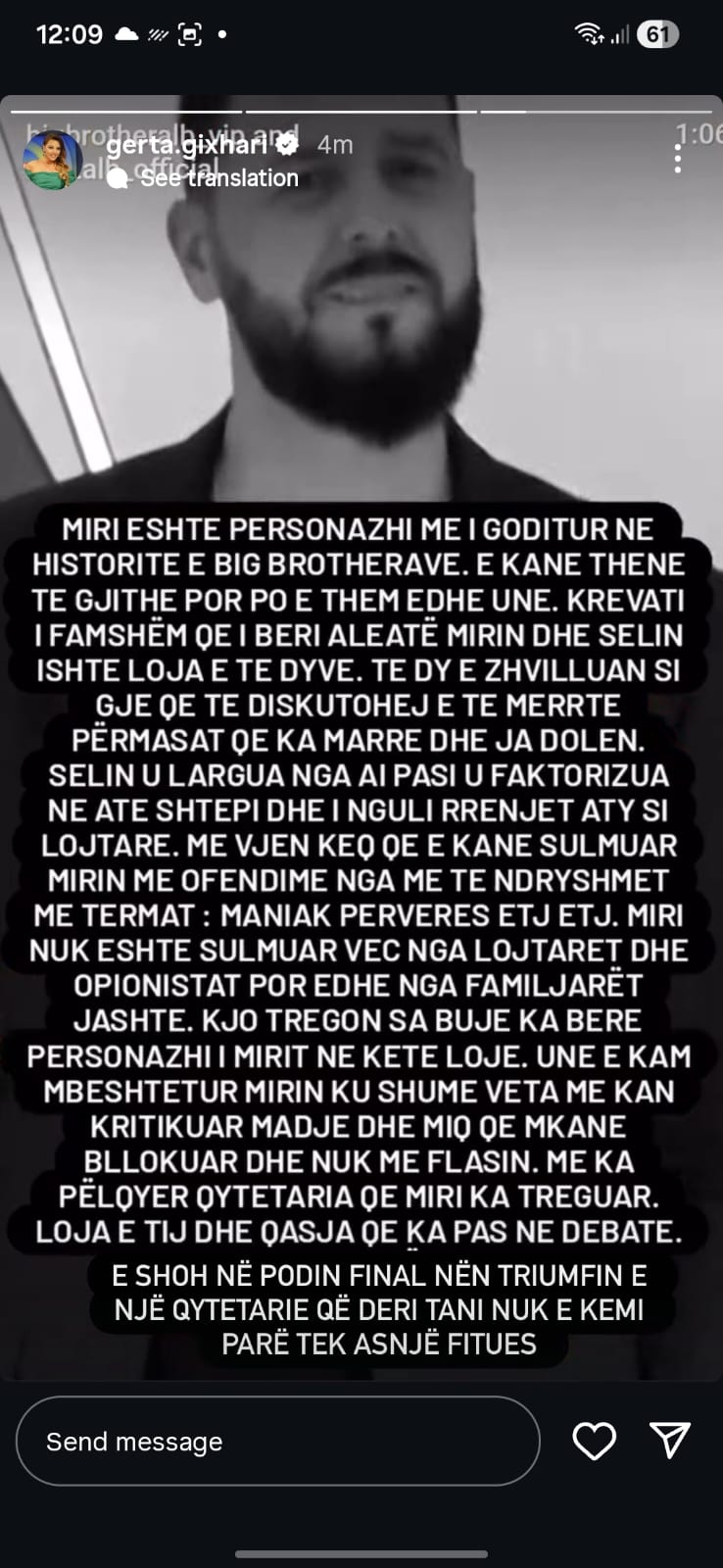 Në deklaratën e saj, Gixhari e cilëson Mirin si një nga figurat më të forta dhe njëkohësisht më të goditura në historinë e këtij formati, duke theksuar se dinamika e krijuar mes tij dhe Selinit ka qenë pjesë e lojës dhe është zhvilluar në mënyrë të natyrshme brenda shtëpisë.