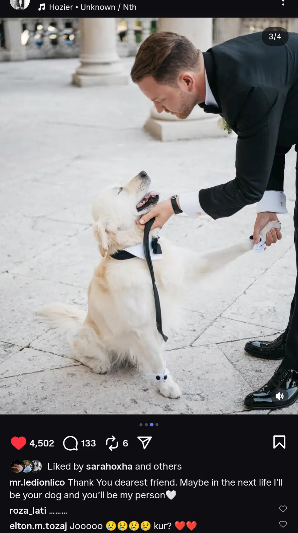 “Faleminderit miku im i dashur. Ndoshta në jetën tjetër unë do të jem qeni yt dhe ti do të jesh personi im.”, shkroi Liço krahas disa fotove të kafshës së tij shtëpiake.