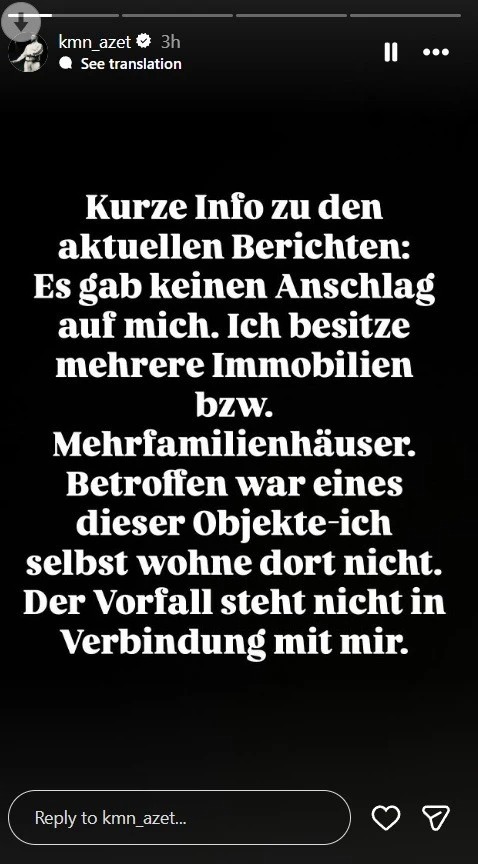 Reperi i njohur me origjinë nga Kosova, Azet, ka reaguar publikisht pas raportimeve të mediave gjermane, të cilat shkruanin se një pajisje shpërthyese kishte shpërthyer mbrëmjen e së mërkurës në hyrje të një pallati apartamentesh në Düsseldorf, objekt që figuron në pronësi të artistit.