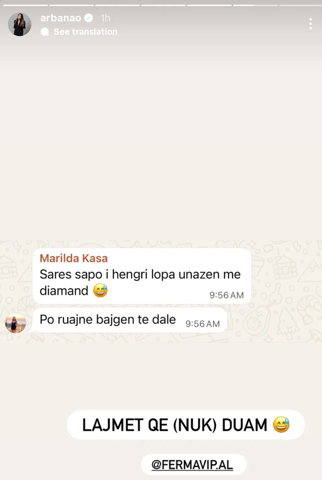 Arbana ka ndarë me ndjekësit në InstaStory një bisedë në WhatsApp.