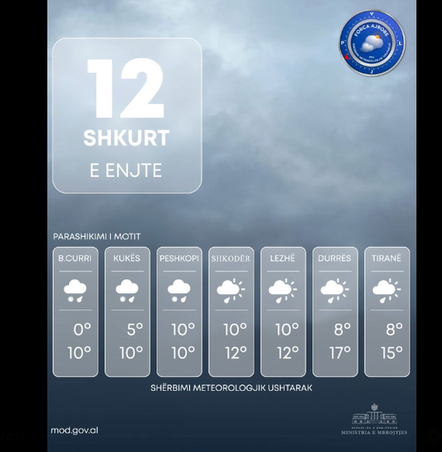 Vranësira mesatare deri të dendura, por edhe reshje shiu me intensitet të ulët. Ky është parashikimi i Shërbimit Meteorologjik Ushtarak për motin gjatë ditës së enjte, ndërsa territori shqiptar do të vijojë të ndikohet nga kushte atmosferike kryesisht të paqëndrueshme.