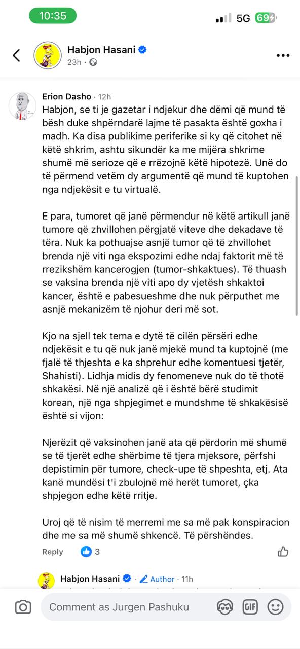 Në rrjetet sociale reagoi menjëherë mjeku Erion Dashi ne postimin e Gazetarit te HASHTAG.AL Habjon Hasani, i cili kritikoi ashpër përhapjen e interpretimit të studimit korean, duke theksuar se një informacion i tillë i pakonfirmuar mund të krijojë panik te publiku.