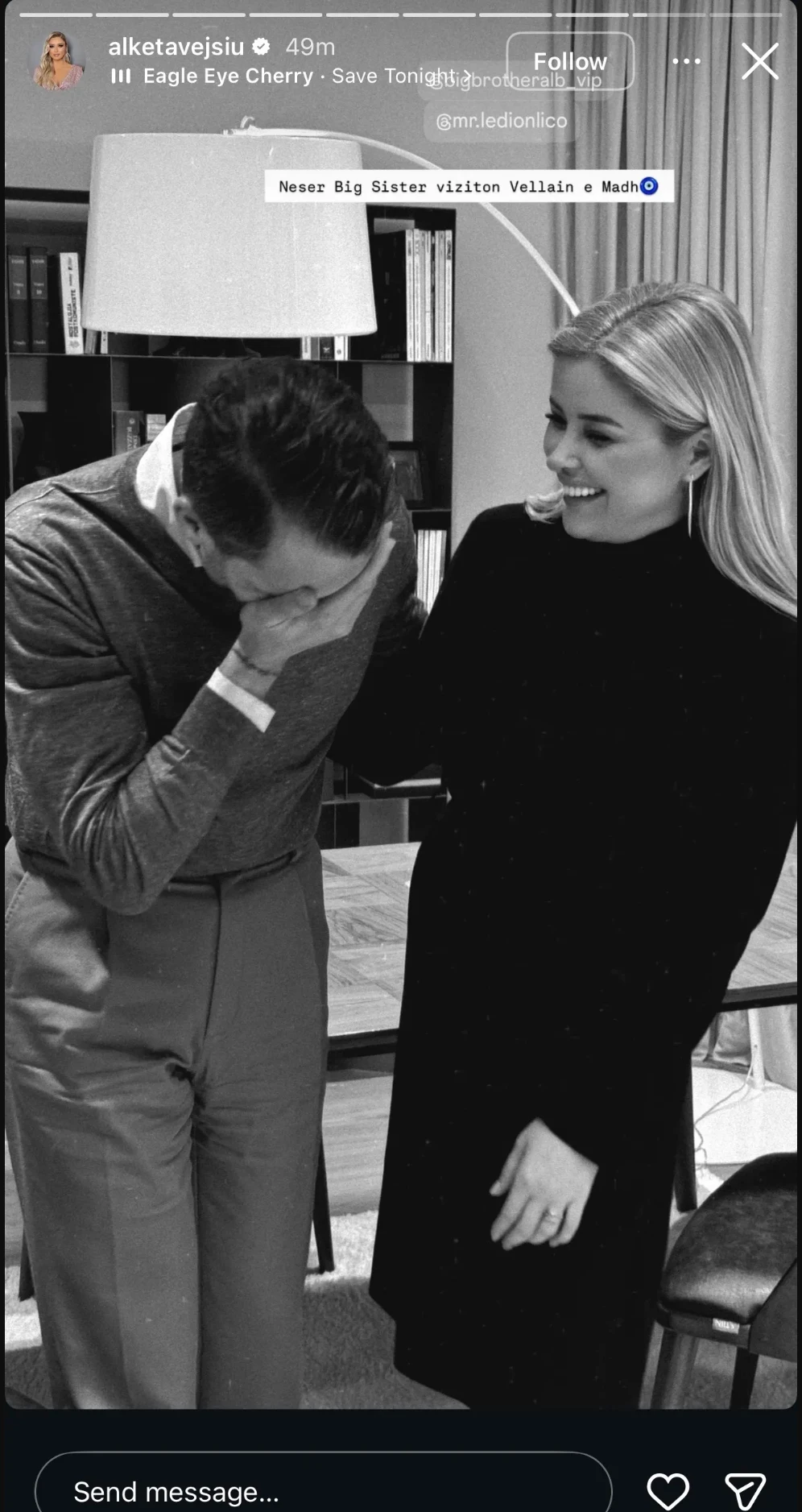 Përmes një fotoje bardh e zi, ku Ledioni shfaqet duke qeshur, Alketa ka zbuluar se nesër do të jetë pjesë e spektaklit të “Big Brother VIP”.