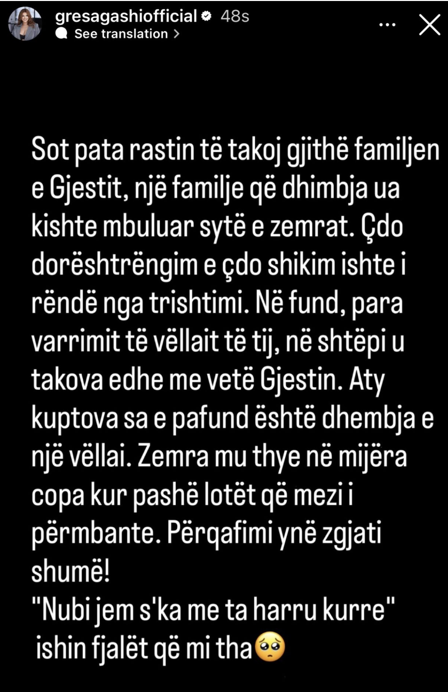 Gresa ndau në rrjetet sociale fjalët prekëse që Gjesti i kishte thënë asaj gjatë kësaj dite të vështirë, duke dëshmuar mirënjohjen e tij për mbështetjen e saj.