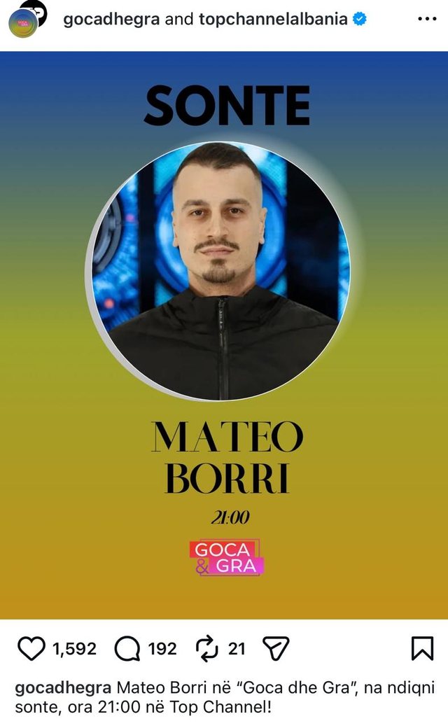 Lajmi, i cili fillimisht qarkulloi si thashethem në rrjetet sociale, është konfirmuar nga vetë produksioni i këtij reality show përmes një postimi zyrtar në Instagram. Sipas njoftimit, Mateo do të jetë i ftuar sonte, në orën 21:00, në emisionin Goca dhe Gra, ku pritet të japë intervistën e tij të parë pas daljes nga loja.