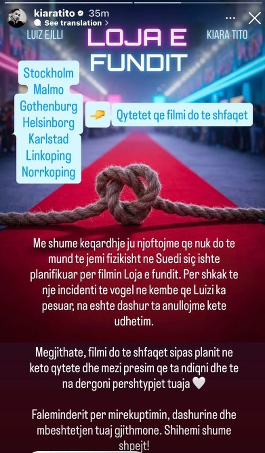 Ndërkohë, ditën e sotme Kiara Tito ka njoftuar përmes një InstaStory se çifti është detyruar të anulojë udhëtimin e planifikuar drejt Suedisë, ku do të merrnin pjesë për promovimin e filmit të tyre “Loja e Fundit”.