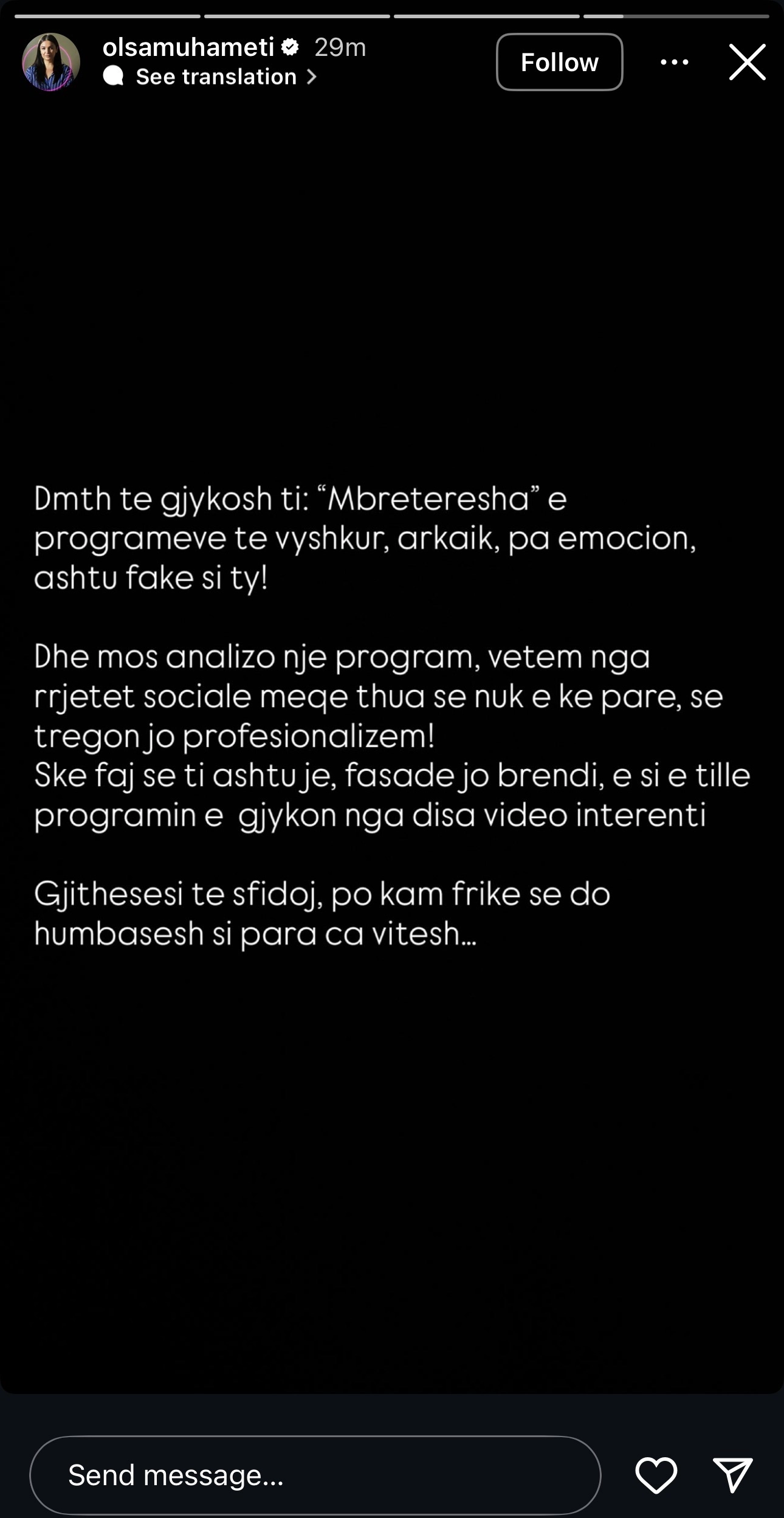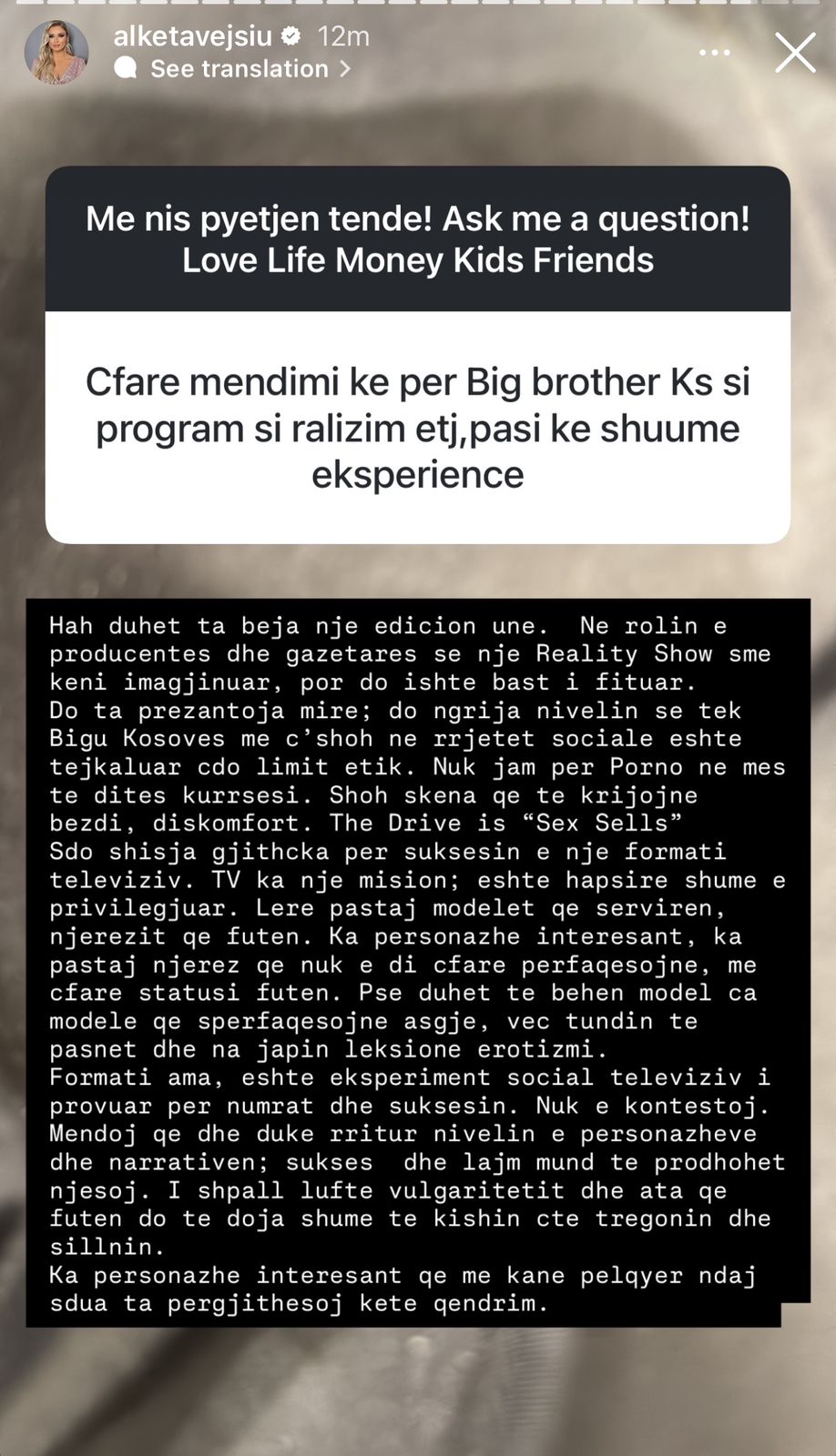Moderatorja Alketa Vejsiu ka bërë një reagim të ashpër ndaj edicionit aktual të “Big Brother VIP Kosova”, duke e cilësuar formatin si një tejkalim të çdo limiti etik dhe duke kritikuar skenat që sipas saj janë të tepruara.
