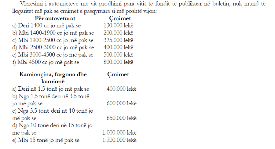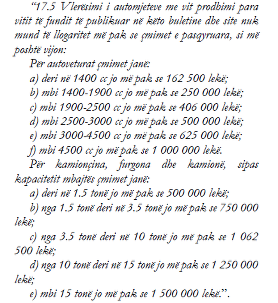 Në udhëzimin e vitit 2018, për mjetet deri në 1.5 tonë pragu minimal ishte 400 mijë lekë, ndërsa udhëzimi i ri e çon këtë vlerë në 500 mijë lekë. Për segmentin 1.5–3.5 tonë, vlera minimale rritet nga 600 mijë lekë në 750 mijë lekë, ndërsa për mjetet 3.5–10 tonë nga 850 mijë lekë në rreth 1.06 milion lekë.