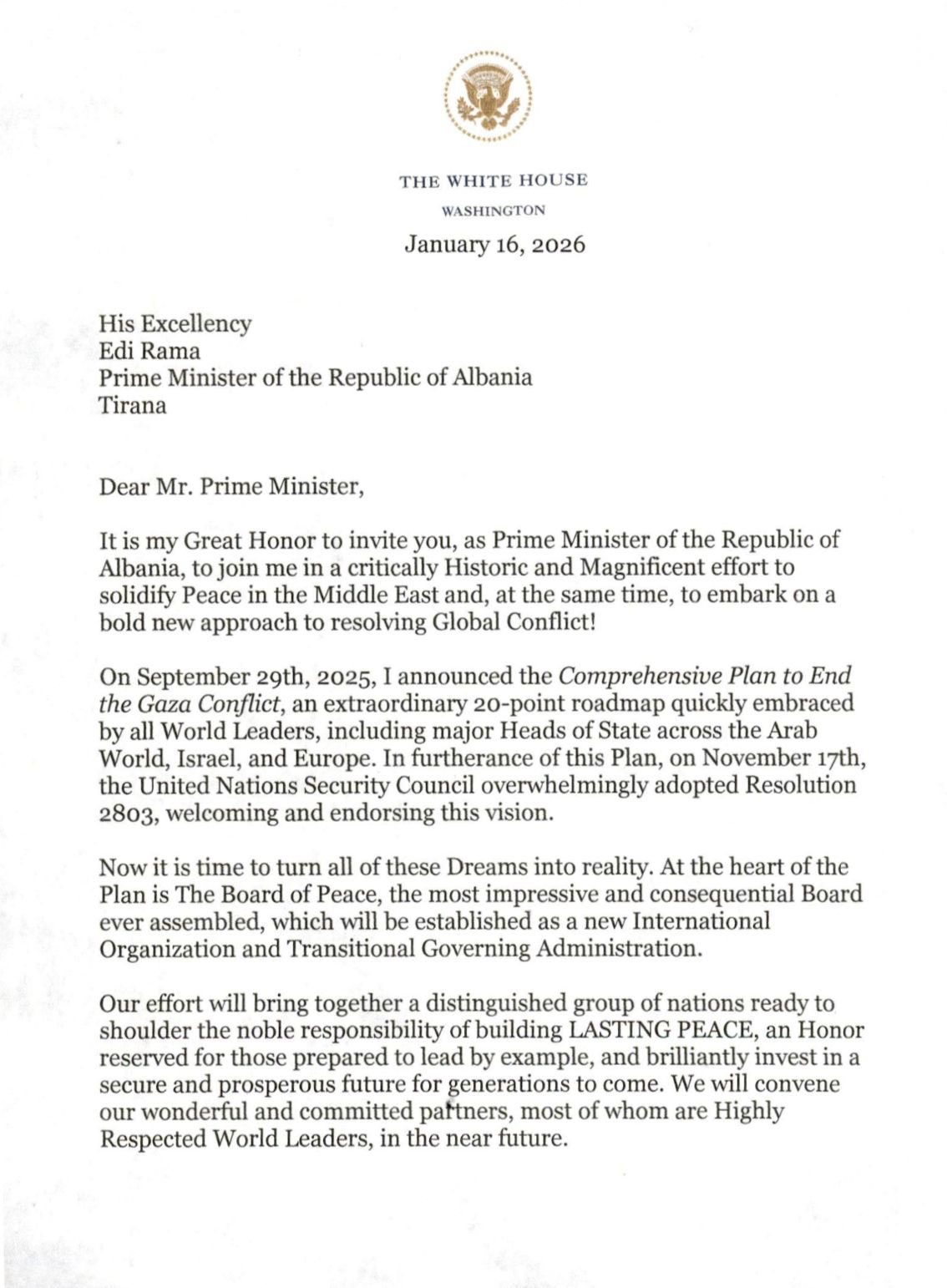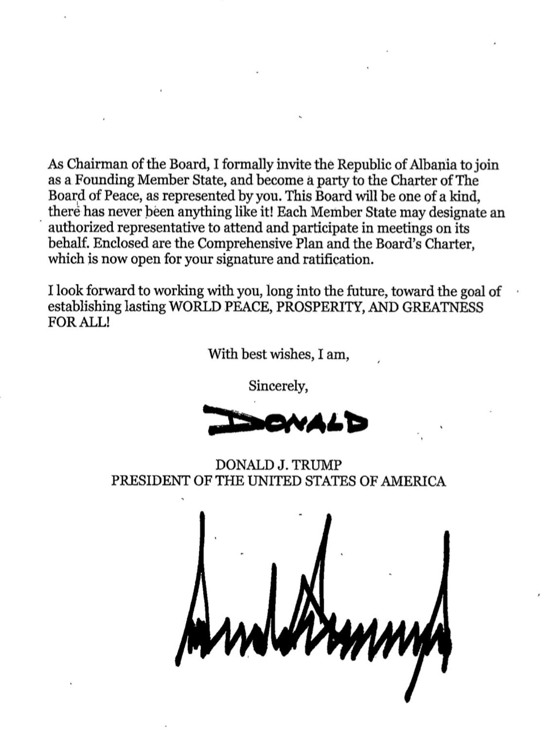 “Si Kryetar i Bordit, ftoj zyrtarisht Republikën e Shqipërisë të përfaqësuar prej jush, të na bashkohet si Shtet Anëtar Themelues, dhe të bëhet palë në Statutin e Bordit të Paqes. Ky bord do të jetë aq i veçantë sa kurrë më parë nuk ka ezistuar diçka e ngjashme me të! Çdo Shtet Anëtar mund të caktojë një përfaqësues të autorizuar në emër të tij për të marrë pjesë dhe kontribuar në takime. Bashkëngjitur gjeni Planin Gjithëpërfshirës, dhe Statutin e Bordit, i cili tani është i disponueshëm për nënshkrimin tuaj dhe ratifikimin”, thuhet ndër të tjera në letër.