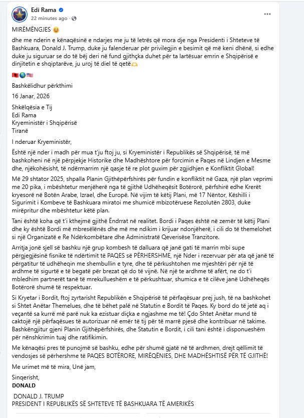 Ndërkohës Sipas letrës që mban datën 16 janar 2026, Presidenti Trump i drejtohet Kryeministrit shqiptar me një ftesë për t’u bashkuar në atë që ai e cilëson si një “përpjekje historike dhe madhështore” për forcimin e paqes në Lindjen e Mesme dhe për një qasje të re në zgjidhjen e konflikteve globale.