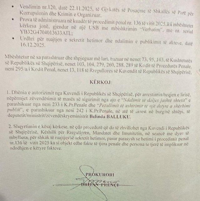 Detaje të reja kanë dalë në dritë nga kërkesa e Prokurorisë së Posaçme (SPAK) drejtuar Kuvendit të Shqipërisë, në të cilat kërkohet heqja e imunitetit dhe arrestimi i zv/kryeministres dhe ministres së Infrastrukturës dhe Energjisë, Belinda Balluku.