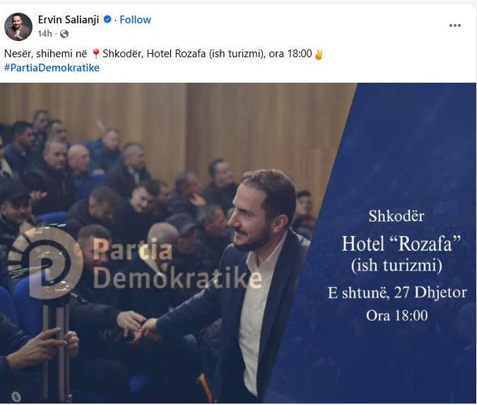 Demokrati Ervin Salianji do të ndalë sot foltoren e tij të takimeve në Shkodër. Ishte vetë ish-deputeti që njoftoi përmes një njoftimi në rrjetet sociale takimin me demokratë, në orën 18:00.