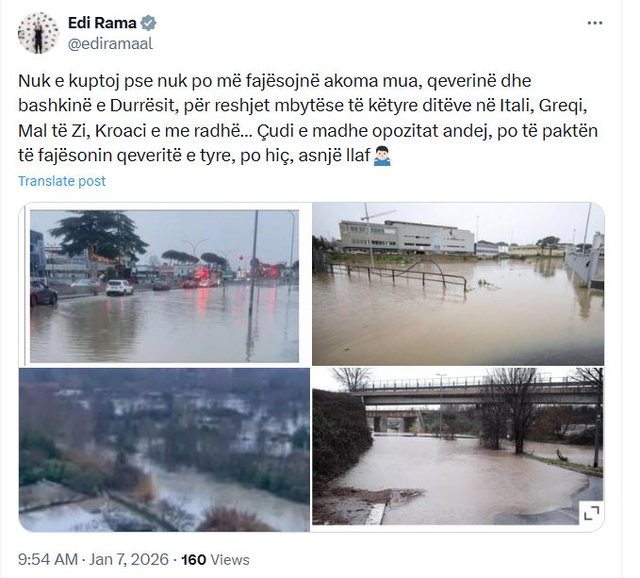 Në një postim, Rama shkruan se nuk e kupton pse ende nuk po fajësohet ai, qeveria apo Bashkia e Durrësit edhe për reshjet e forta që kanë goditur Italinë, Greqinë, Malin e Zi dhe Kroacinë.