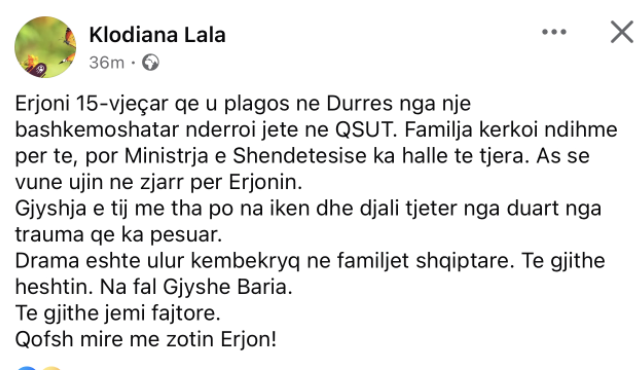 Erjoni 15-vjeçar qe u plagos ne Durres nga nje bashkemoshatar nderroi jete ne QSUT. Familja kerkoi ndihme per te, por Ministrja e Shendetesise ka halle te tjera. As se vune ujin ne zjarr per Erjonin.