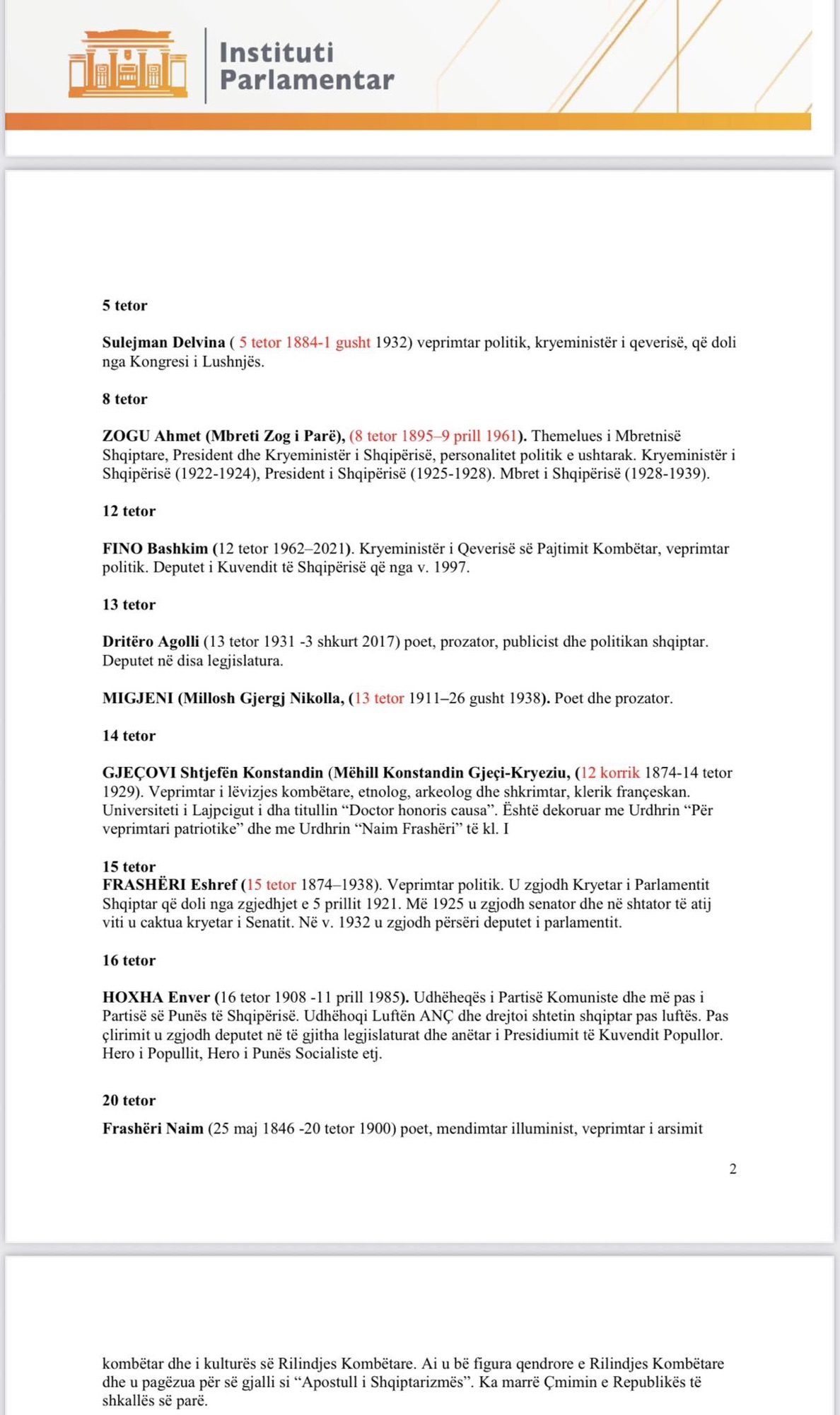 Instituti Parlamentar ka publikuar emrat e figurave kombëtare që do të nderohen gjatë muajit tetor, por përfshirja e ish-diktatorit Enver Hoxha ka shkaktuar debate të forta në opinionin publik.
