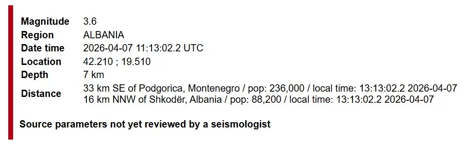 Sipas vlerësimeve paraprake, magnituda ka qenë 3.6 sipas Rihter, teksa thellësia e lëkundjes vlerësohet 7 km.