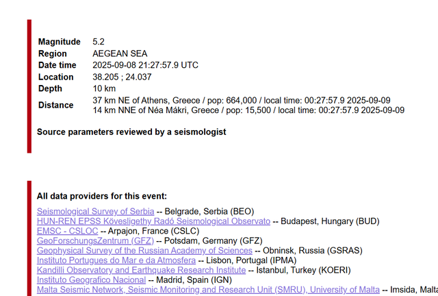 Instituti Gjeodinamik i Athinës konfirmoi aktivitetin sizmik, i cili u ndje në të gjithë rajonin.