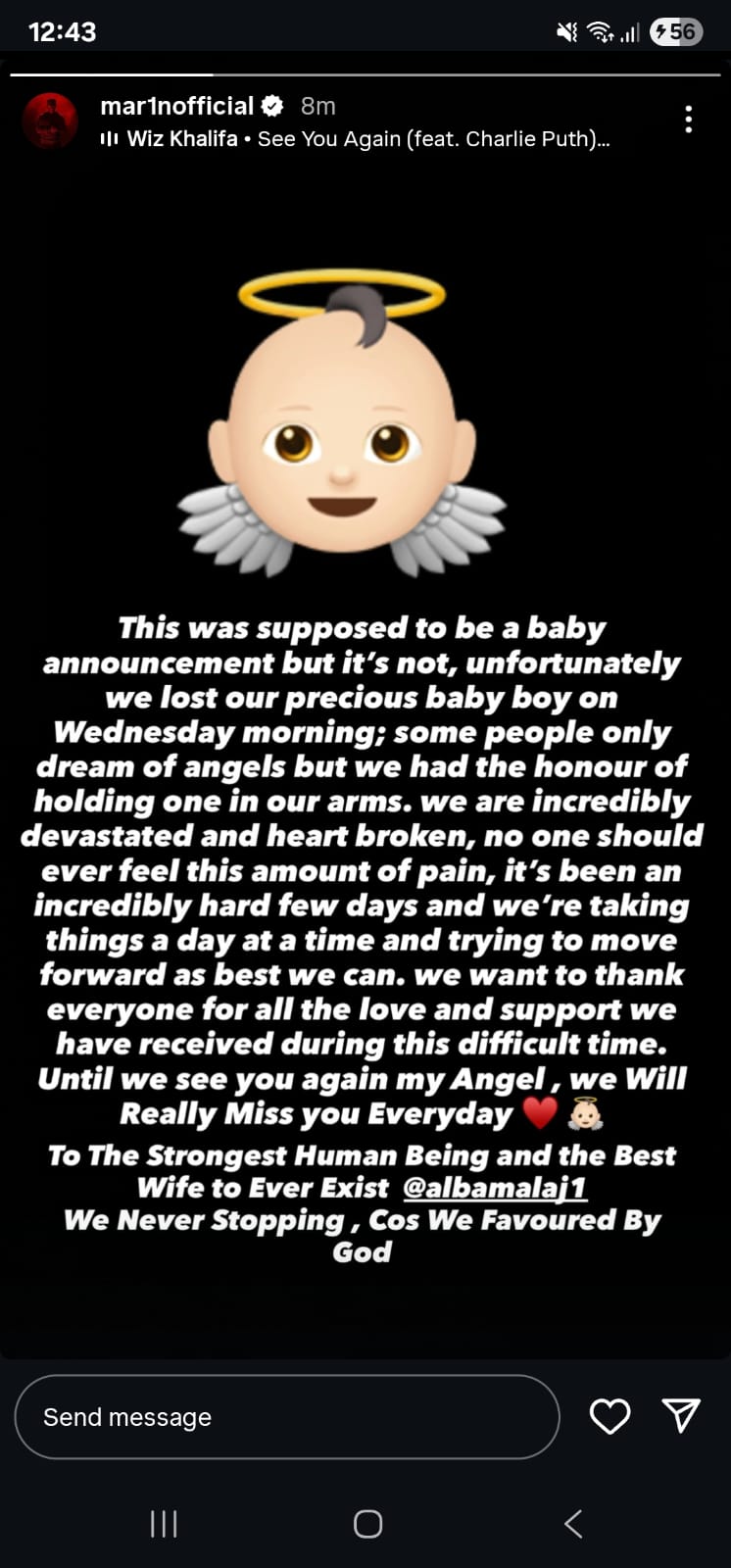 Në statusin e tij, Marin shprehet se kjo ishte menduar të ishte një lajm i gëzueshëm për ardhjen në jetë të vogëlushit, por fatkeqësisht jeta ka marrë një kthesë të dhimbshme për familjen e tij.