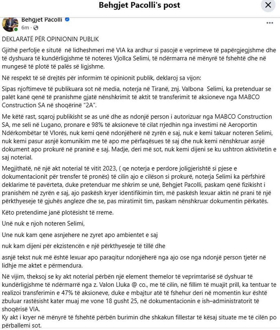 Behgjet Pacolli përmes një deklarate të gjatë shprehet se noterja në Tiranë, Valbona Selimi, pretendon se palët kanë qenë të pranishme gjatë nënshkrimit të aktit të transferimit të aksioneve nga MABCO Construction SA në shoqërinë “2A”.