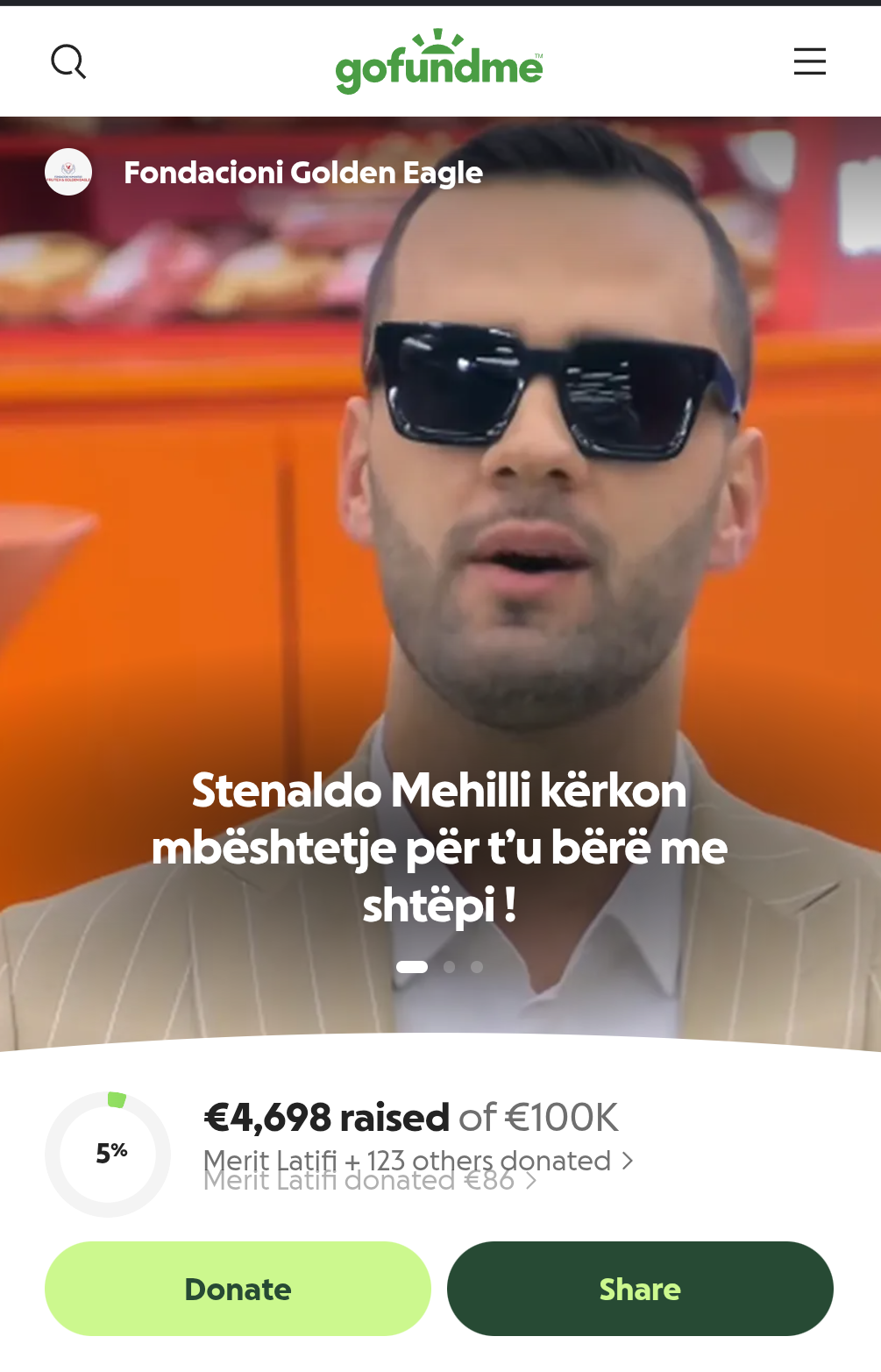 Në platformën GoFundMe është hapur një fushatë nga “Fondacioni Golden Eagle” me një qëllim të qartë, i cili shfaqet edhe në titullin e nismës: “Stenaldo Mehilli kërkon mbështetje për t’u bërë me shtëpi!”.