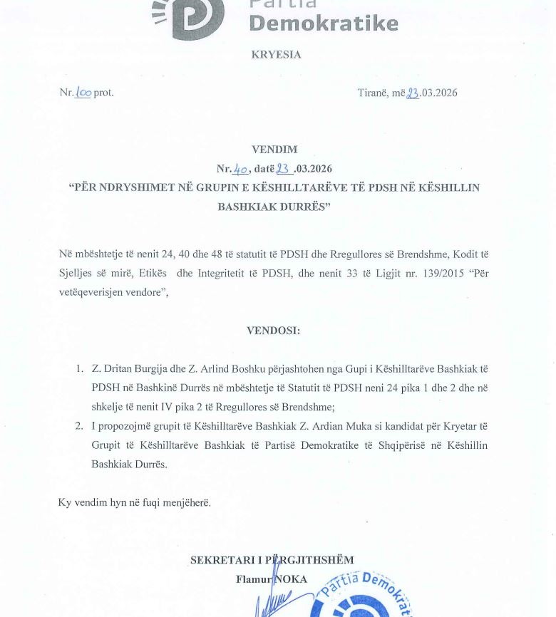 Vendimi mban datën 23 mars 2026 dhe është firmosur nga sekretari i përgjithshëm i PD-së, Flamur Noka.